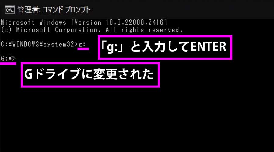 これでGドライブへがカレントドライブ(操作対象のドライブ)になります。