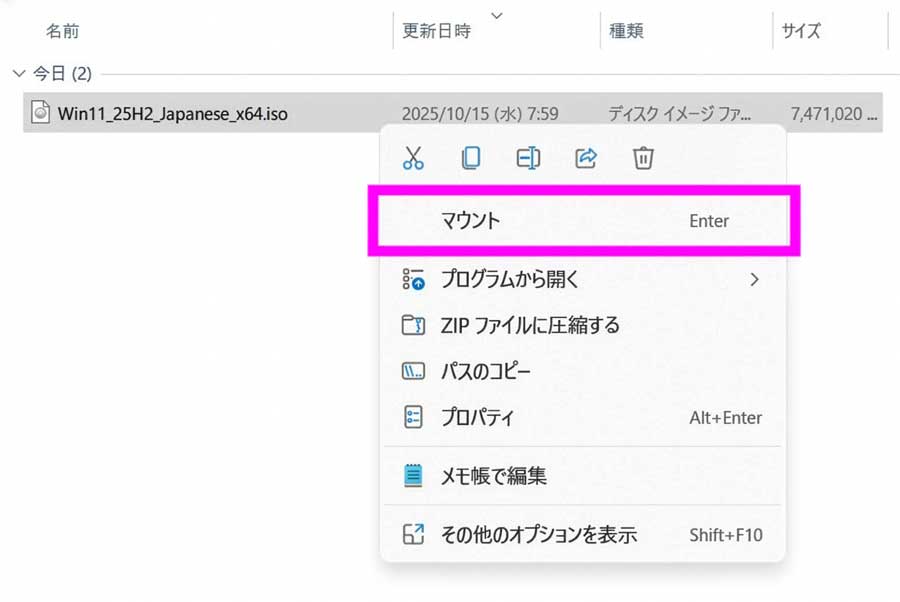 ダウンロードしたISOファイルを右クリックして「マウント」を選択。