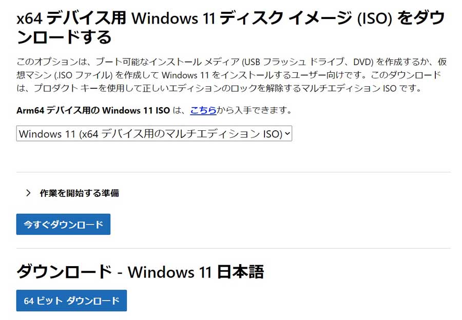 一番下の「x64 デバイス用 Windows 11 ディスク イメージ (ISO) をダウンロードする」のダウンロードを選択から、